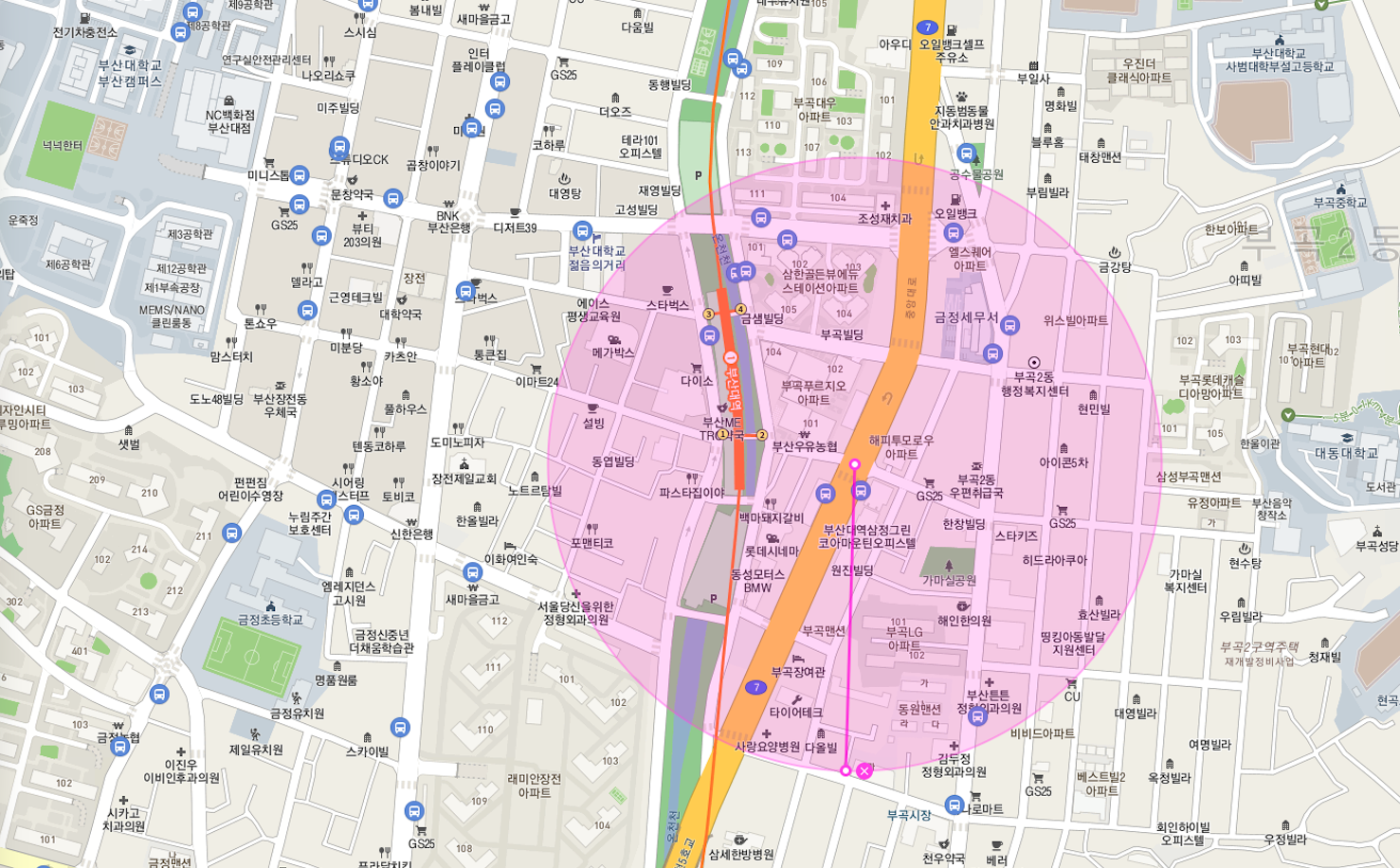 원룸 임차 수요 높은 부산대학교 지하철역 도보 5~10분 사이의 역세권이고