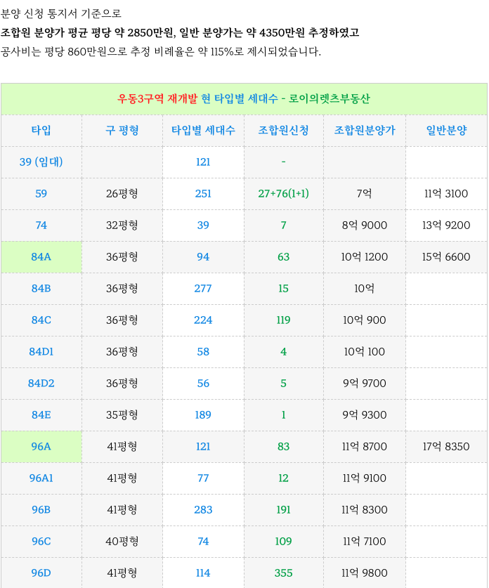 4. 타입별 세대수 및 분양가 : 우동3구역 재개발 :