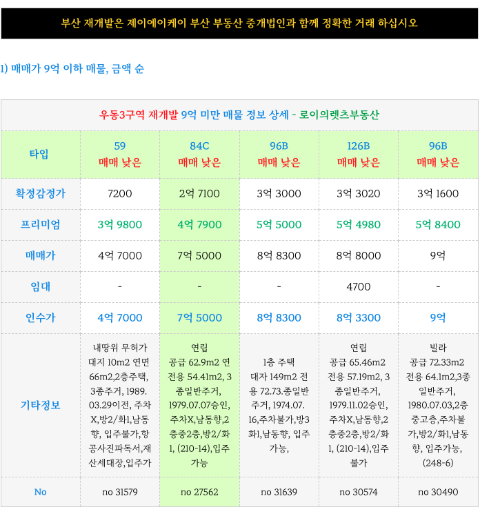 1. 타입별, 매매가별 매물 업데이트 : 우동3구역 재개발 :