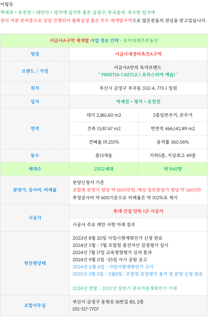 부산 전역 재개발에 대해 궁금하신 사항은 방문 또는 연락주시면 자세히 설명 드리겠습니다.