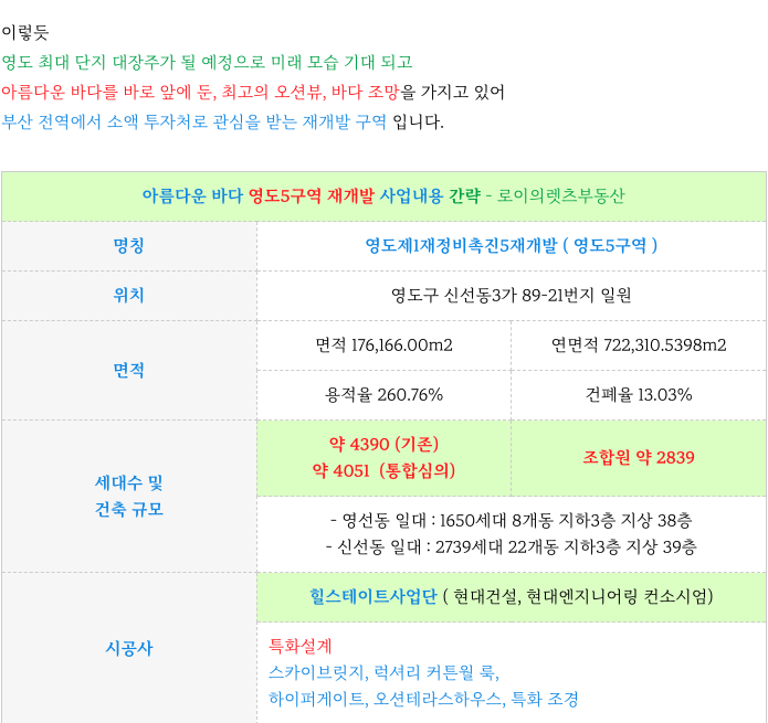 5. 사업 특징 간략 : 영도5구역 재개발 :