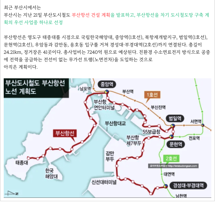 또한, 영도에서 북항 그리고 남구 대연동으로 이어지는 부산항선을 부산시의 차기 도시철도 계획으로