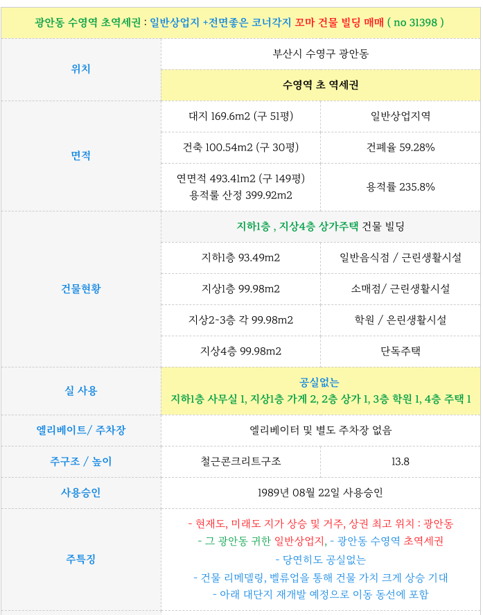 광안동 초역세권 : 일반상업지 + 전면좋은 코너 꼬마 건물 빌딩 매매