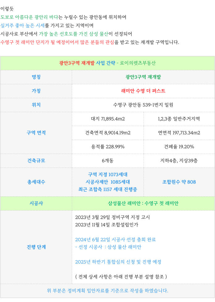 5. 광안3구역 재개발 : 재개발 사업 주요 특징 간략 재정리 :
