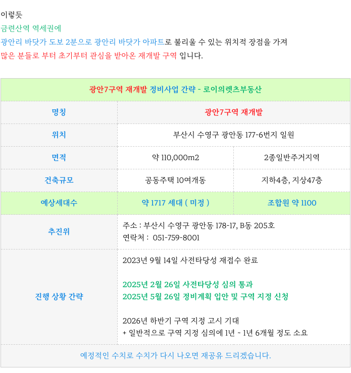 광안7구역 재개발 : 사업 진행 상항 & 이후 일정 : 등 추가 정보는 아래 페이지를 참고 부탁드립니다.
