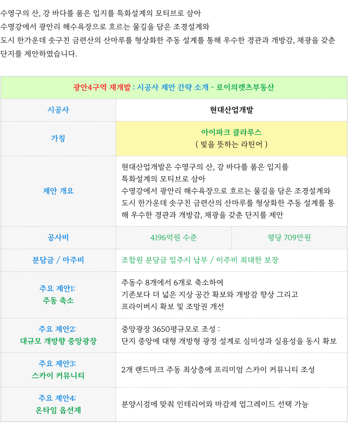 3. 광안4구역 재개발 : 시공사 현대산업개발 주요 제안 :
