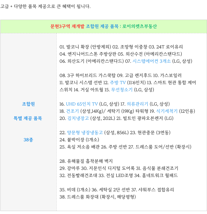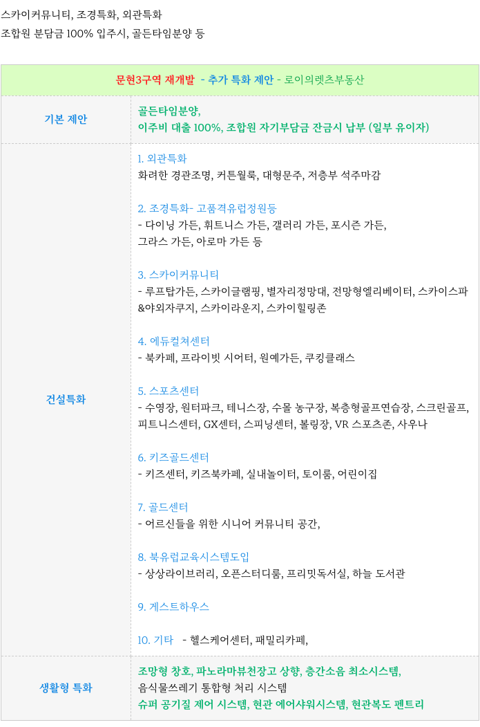 이주비 100% 지원, 조합원 분담금 입주후 1년후 납부, 다양하고 고급 조합원 제공 품목