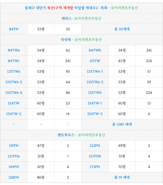3. 대연8구역 재개발 : 계획된 각 타입별 세대수 :