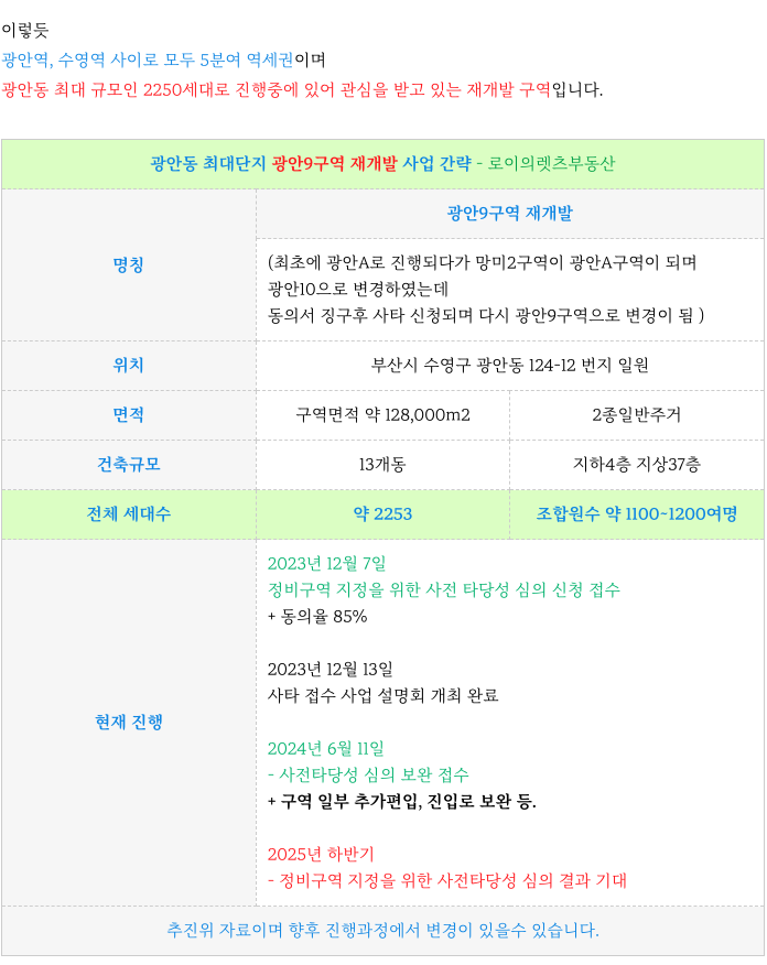 (최대단지) 광안9구역 : 재개발 : 특징, 입지, 진행상황, 일정 & 소액 매물