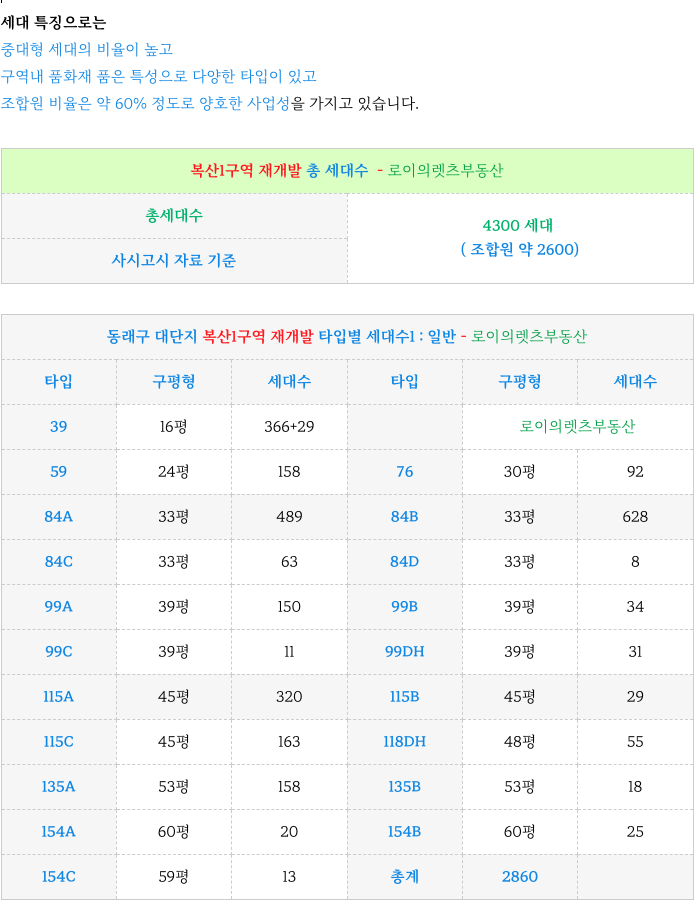 4. 현재 계획된 각 타입별 세대수 : 복산1구역 재개발 :