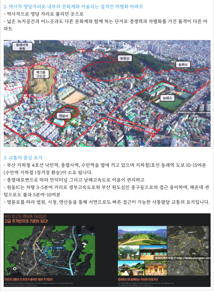 구역 인근으로 동래시장, 동래구청등이 있어 부산 전역으로 이동하는 다양한 버스 노선이 있어 편리합니다.