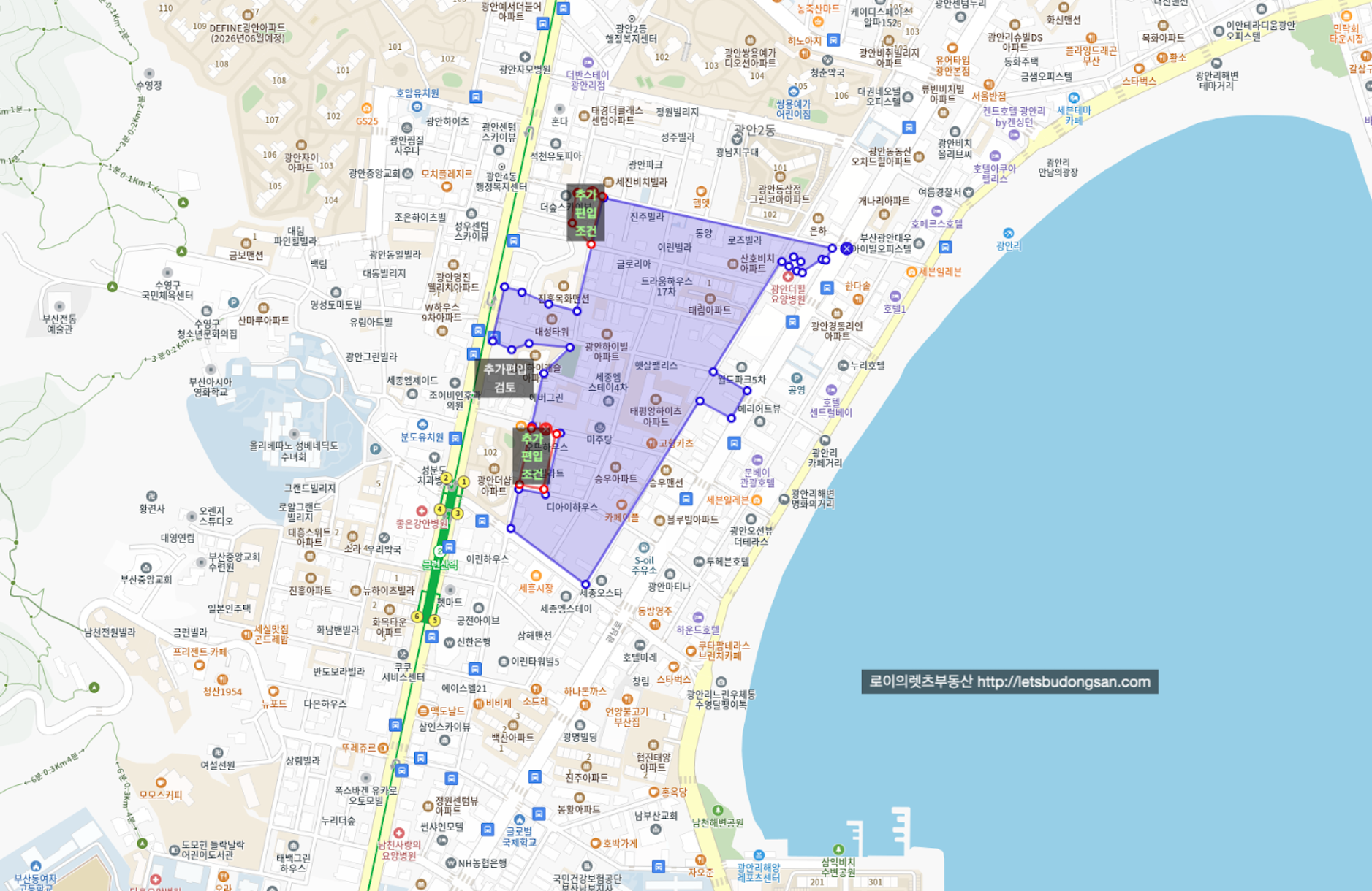 수영구의 많은 예정지들 중에서 가장 좋은 입지중 하나로 꼽히고 있는 재개발 구역 입니다.