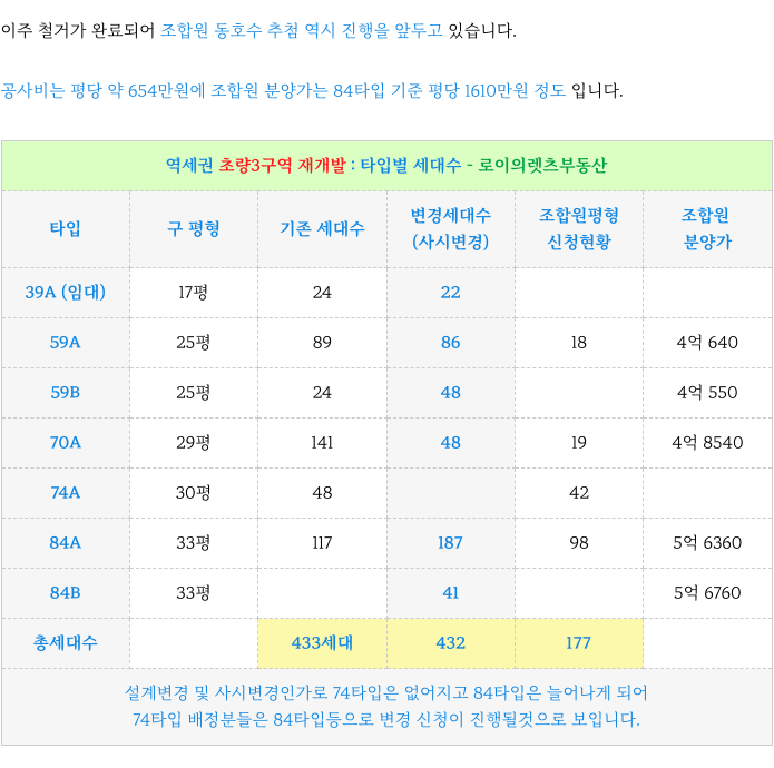 이에 따라 사시변경인가를 득하였고 74타입 신청 조합원 분들이 84로 변경등이 발생하여