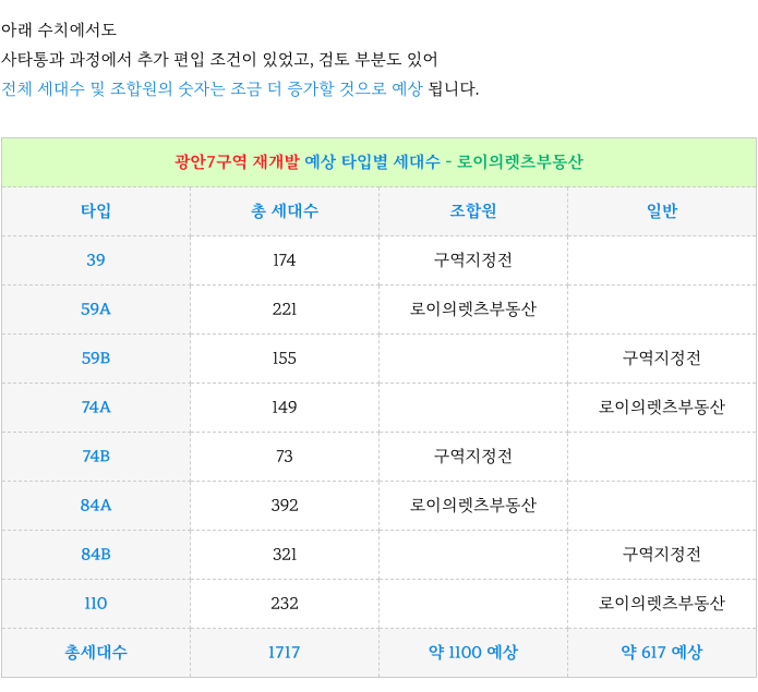 4. 광안7구역 재개발 : 계획된 각 타입별 세대수 :