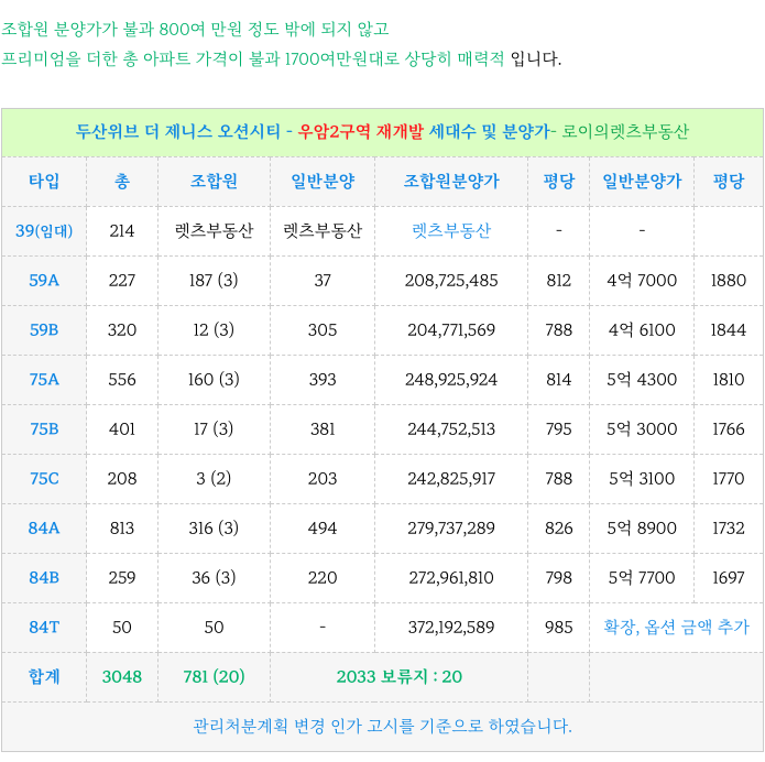 두산위브더제니스 오션시티 추/천 드리는 조합원 입주권 매물 소개해 드리겠습니다.