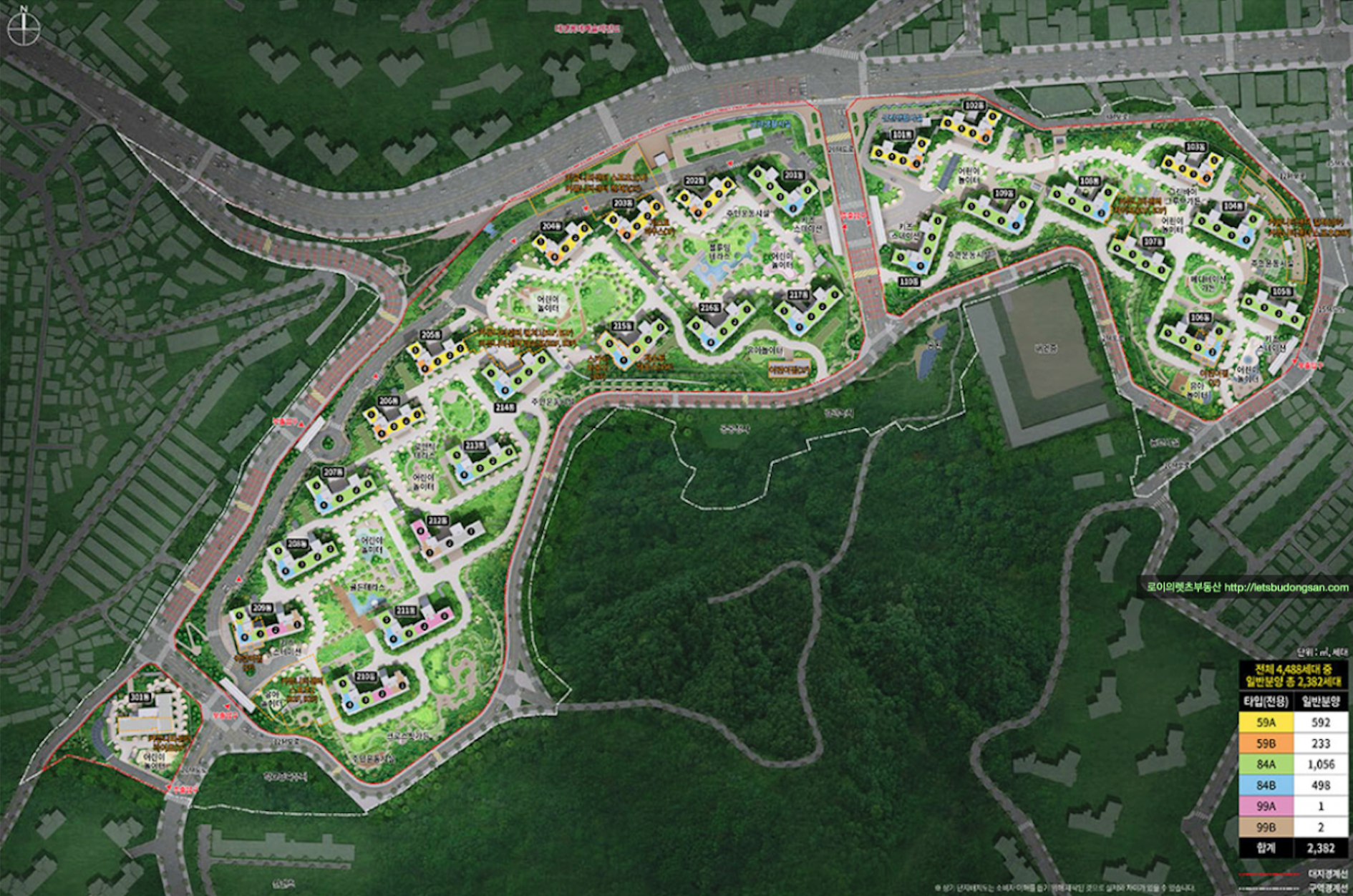 특화설계등 반영하느라 다소 줄기는 하였지만 여전히 4300여 세대 최대 단지입니다.