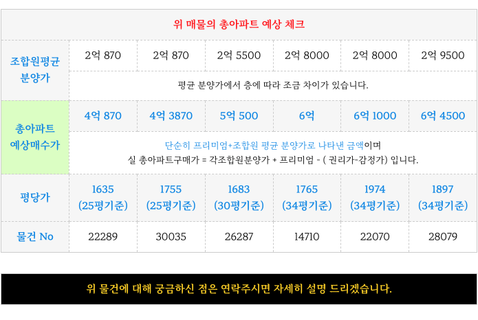 아래 물건들의 추가 문의는 물건 번호를 말씀 해 주시면 빠르게 설명 가능합니다.
