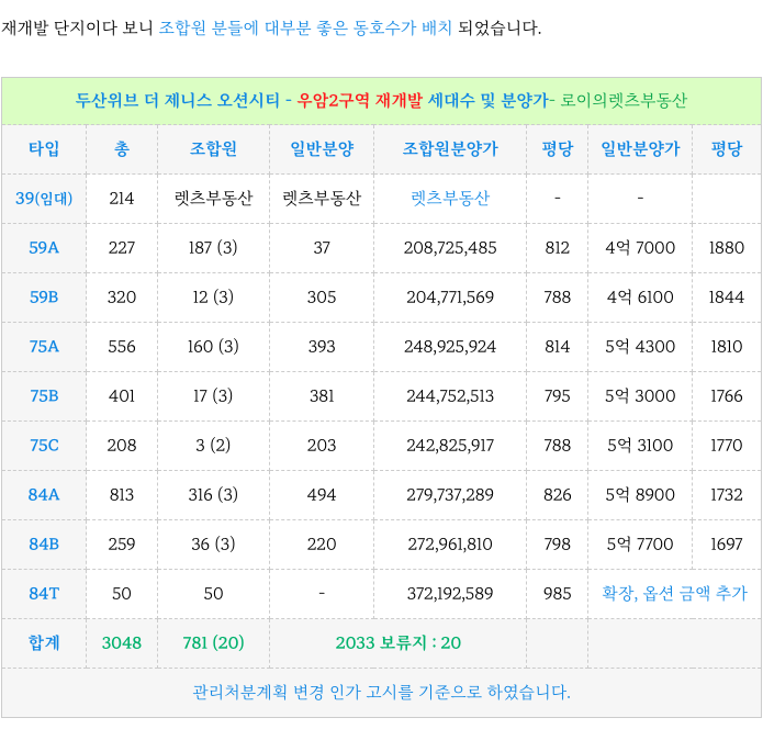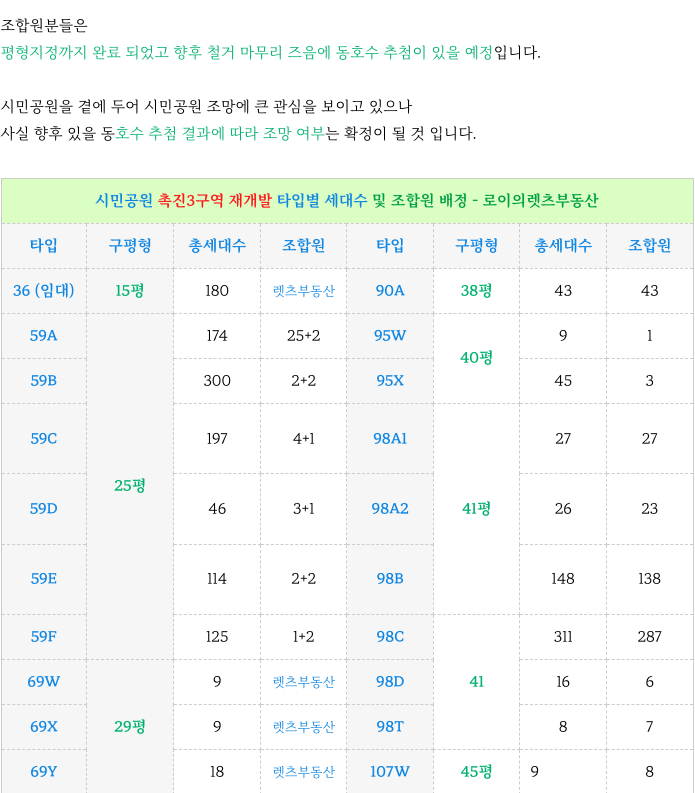 2. 시민공원 촉진3구역 재개발 : 타입별 세대수 간략 :