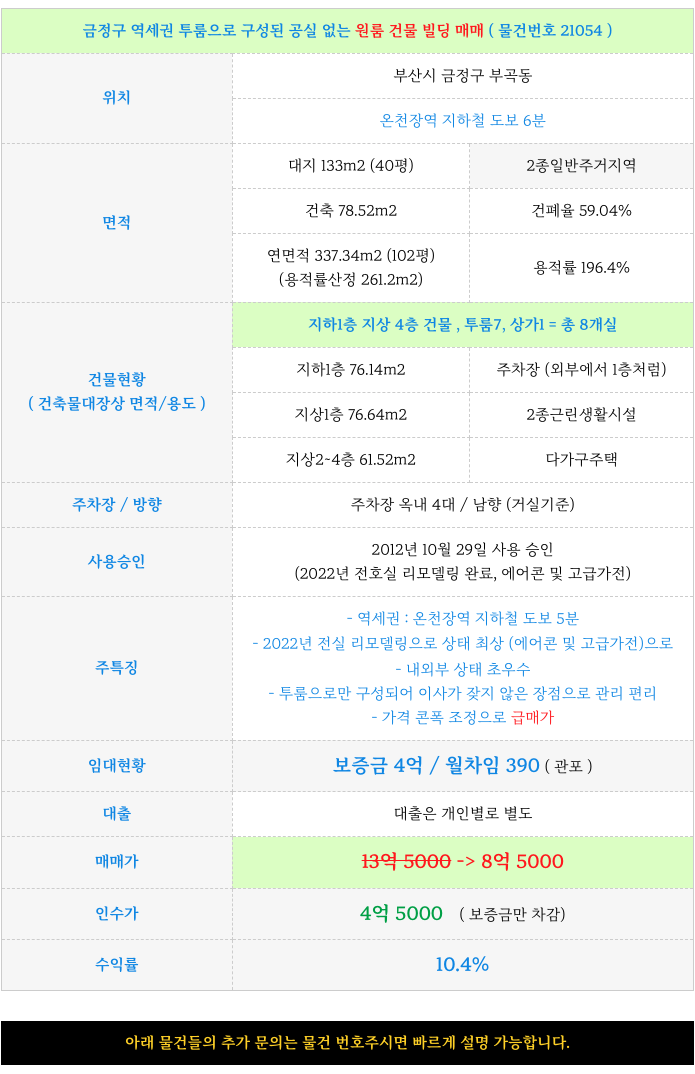 부산 동래구, 금정구 알찬 공실없는 급매 원룸 통 건물 매매 (0) | 2025.09.03 |