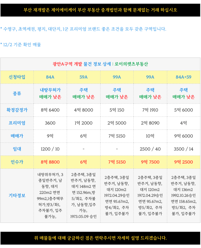 2. 광안A구역 재개발 : 현 매물 (확정감정가+타입) 소개 :