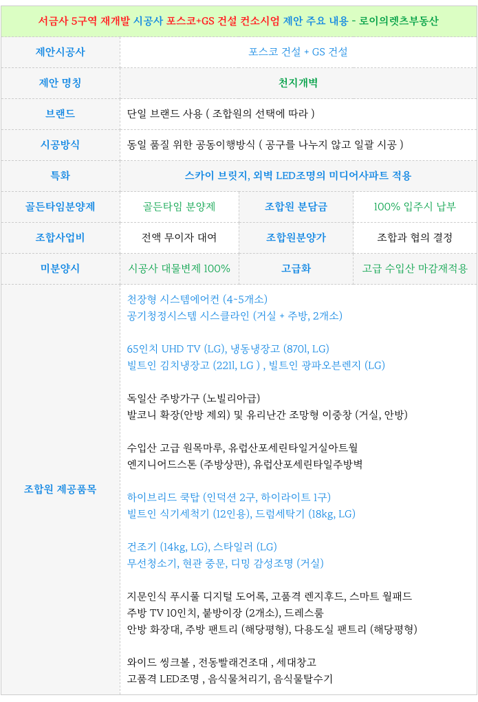 포스코, GS 건설 특화, 골든타임분양제, 조합원 분담금 입주시 100% 등.