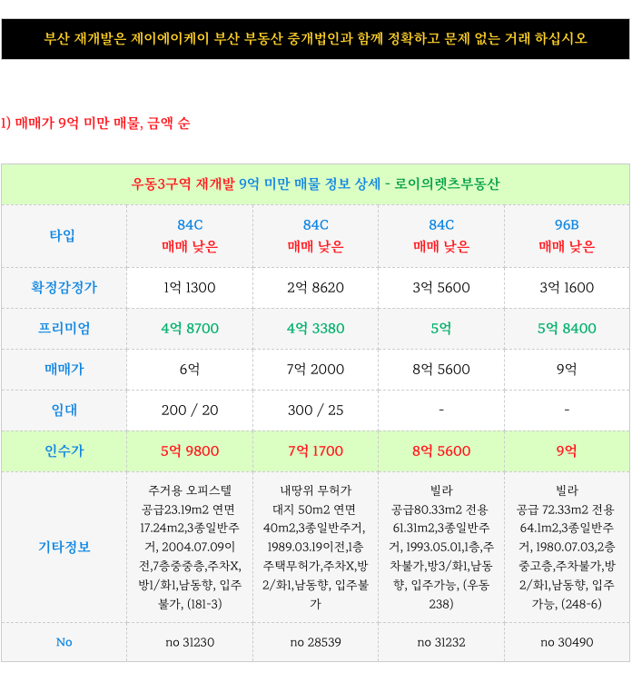 1. 우동3구역 재개발 : 현 타입별, 가격별 매물 소개 :