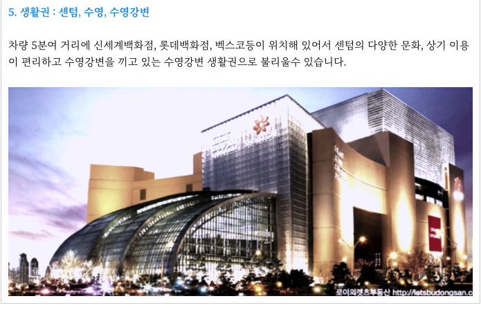 - 초품아, 전통시장, 대형마트, 지하철 준 역세권, 수영강변, 해운대 센텀생활권
