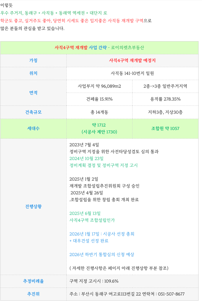 2. 현 매물 정보 업데이트 소개 : 사직4구역 재개발 :