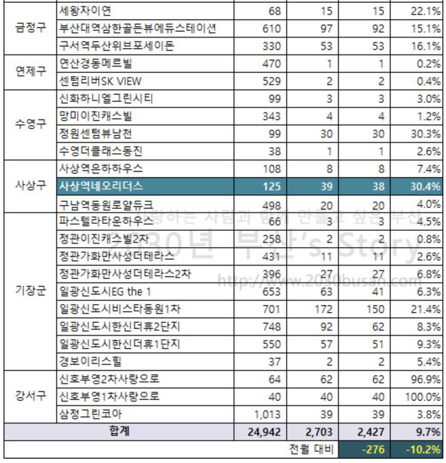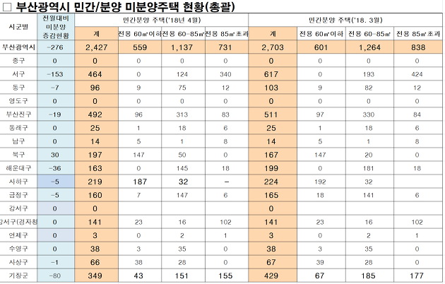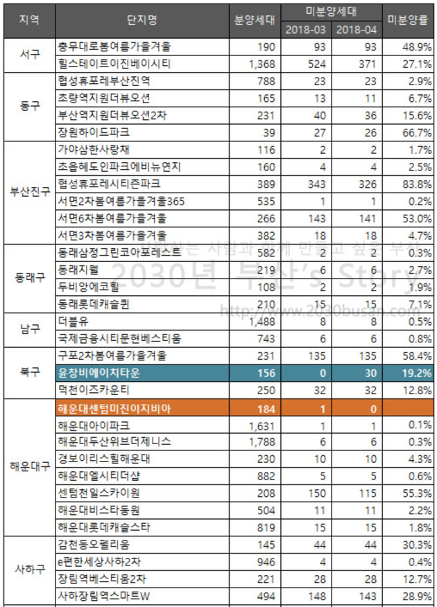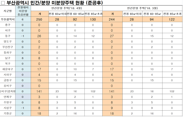 그리고 부산시에서도 매월 구별, 아파트별 세부 미분양 아파트 현황을 발표하고 있습니다.