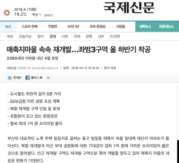 아침에 접수된 따끈한 " 좌천범일통합3지구 "