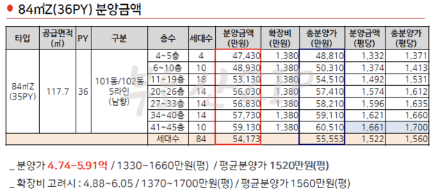 84B는 1460만 (4.73억~5.71억), 84C 1430만 (4.68억~5.71억)