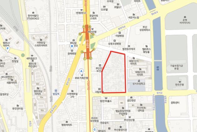 부산 도심의 한가운데인 서면 다음의 범내골역에서 도보 3분 거리 초 역세권 재개발 구역입니다.