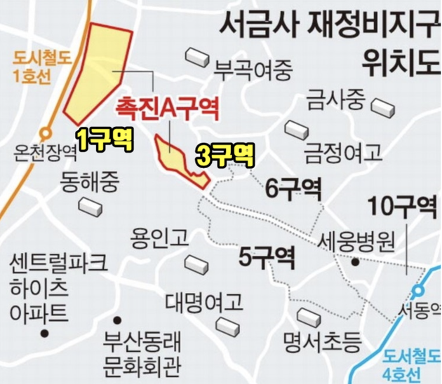 서금사의 많은 재정비 촉진구역에서 기존 1, 3구역이 2015년 통합되었습니다.