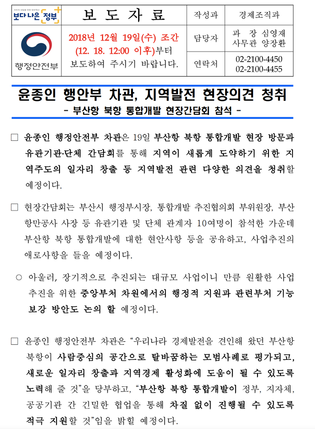 가장 최근 기사로는 아래 내용으로 윤종인 행안부 차관의 북항 재개발을 적극 지원하겠다는 내용이 었습니다.