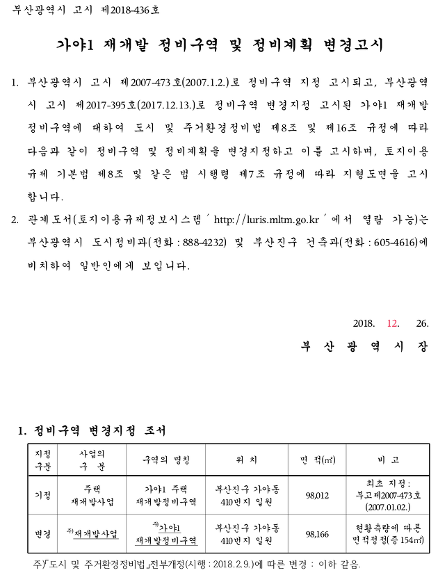 가야1구역 간력 정보를 드리고 변경 고시된 부분도 같이 안내해 드리겠습니다.