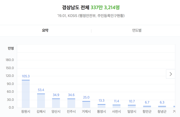 경상남도에서 진주를 넘어서서 창원 > 김해 에 이은 3위로 약 34만 9,265명으로