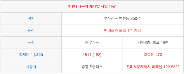주요특징 | - 부산지하철 1호선 범내골 초역세권 - 초품아 ( 성서초등학교 ) - 부산 국제 금융센터 수요층 계속 증가 - 동천 수질 개선 작업 진행중범천1-1구역에 관심이 있으신 분들은 | |