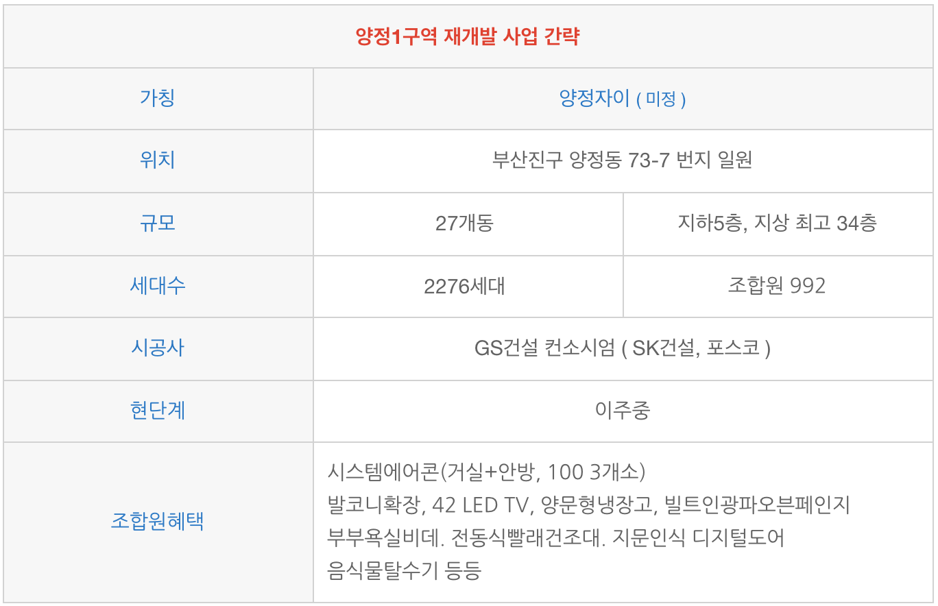 - 양정2구역 : 가장 빠른 진행과 조합원 분양가가 상대적으로 낮은 반면 다소 지하철에서 멀리 있음