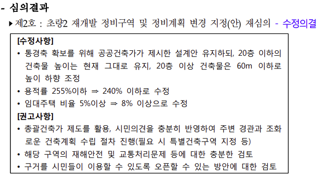 - 건축물 높이는 현재 그대로 유지하되, 20층 이상 건축물은 60m 높이로 조정