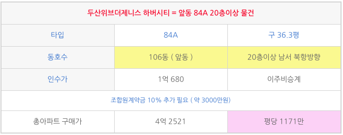 두산위브더제니스하버시티 - 84A 앞동 106동 20층이상 조합원입주권