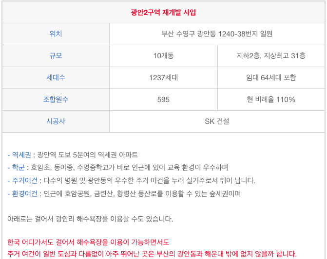 광안2구역 재개발에 관심이 있으신 분들은 연락 주시면 자세히 설명을 드리도록 하겠습니다.
