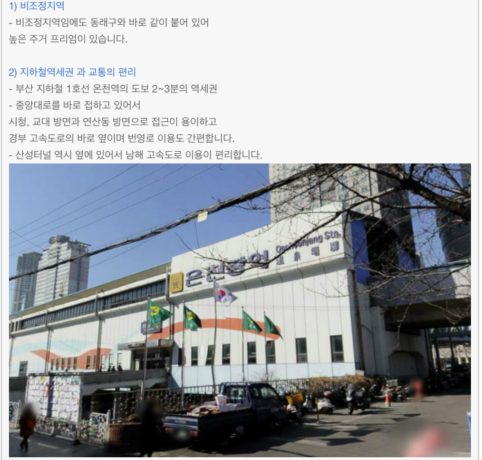- 온천장역의 바로 옆 초 역세권 지역이며 평지에 위치