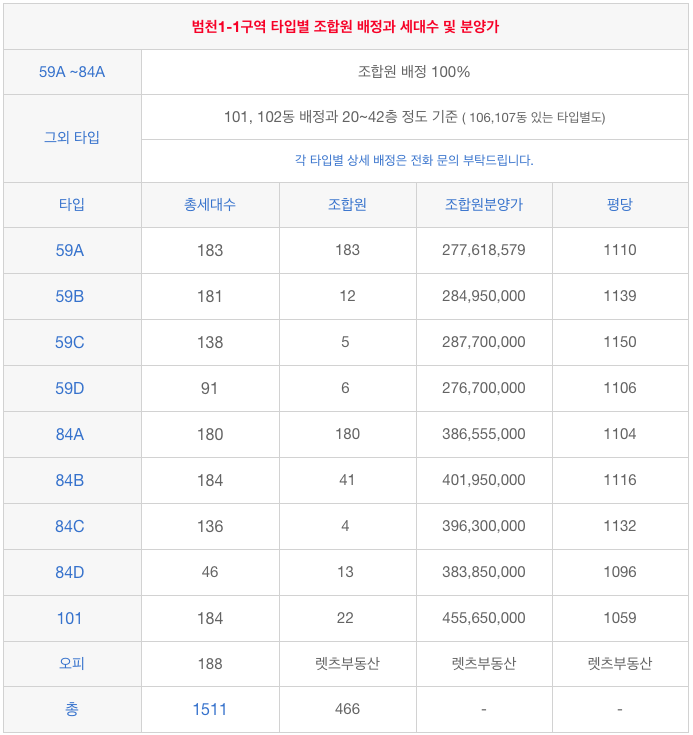 범천1-1구역 재개발의 각 타입별 세대수와 조합원 동/ 층 배정 입니다