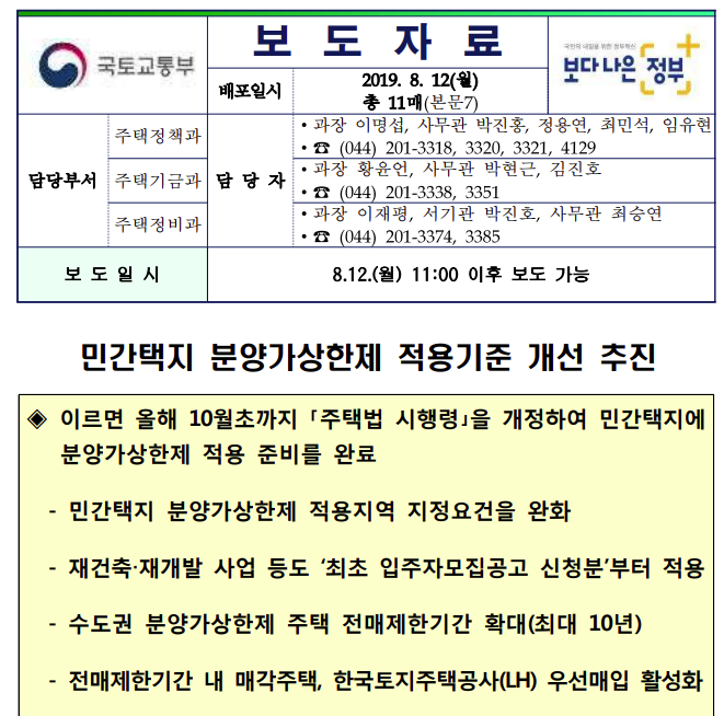 금일 오전에 국토교통부를 통해 발표된 (2019년 8월 12일)