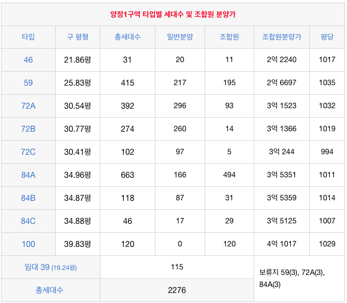 양정1구역 재개발의 각 평형별 세대수와 조합원 분양가를 소개해 드립니다.