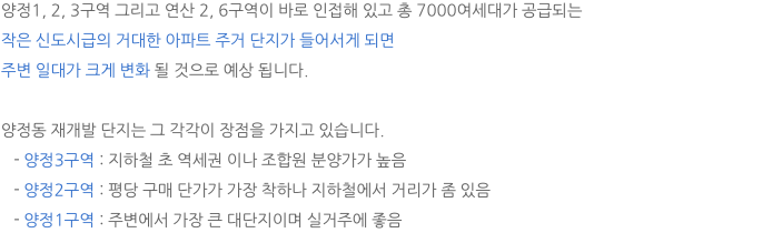 역세권의 양정3구역은 은 대로변과 가까워 다소 번잡하고 양정2구역은 지하철에서는 꽤 멀고