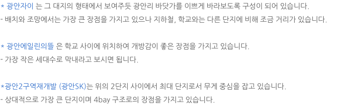 그저 수영구 광안동에 위치하고 있다는 것만으로 뛰어난 실거주 + 환경 여건 을 가지고 있습니다.
