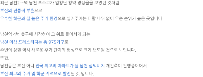 이러한 남천동의 중심인 남천역의 초역세권에 위치해 있어서 향후 시세적으로도 더 가치가 높이 상승할 것으로 보입니다.