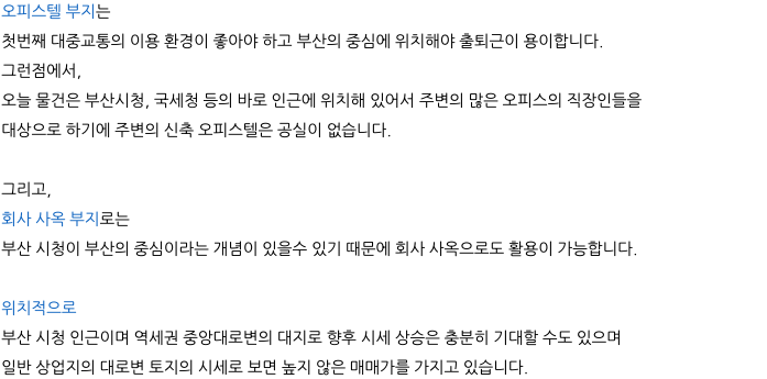 일반 상업지역 대로변인데도 높이 제한이 없으며 도보로 부산 지하철 1호선 부산시청역 이용할 수 있는 위치입니다. |