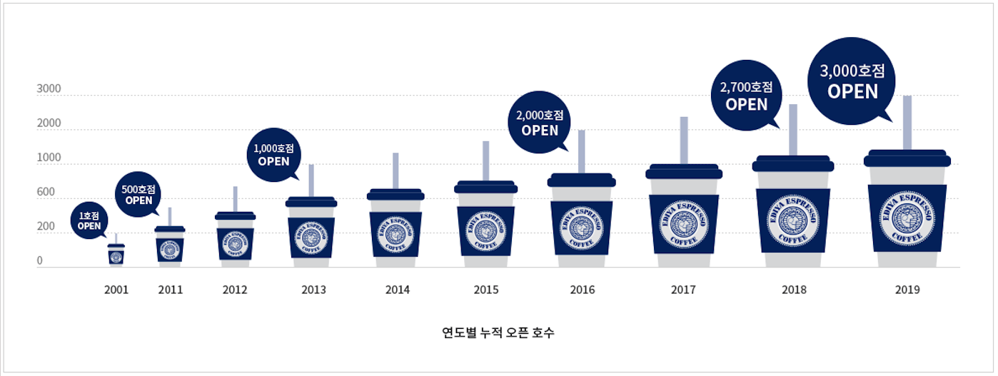 18여년 만에 3000호점이 오픈된 만큼 한국에서는 커피전문으로 자리 잡은 최고의 커피전문점중 하나 입니다.